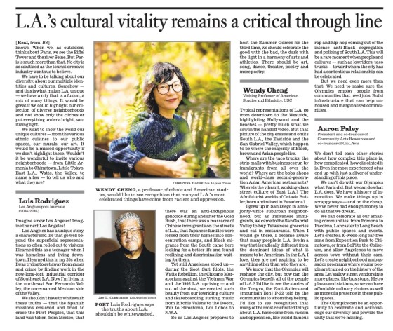 I was interviewed by Los Angeles Times reporter Thomas Curwen about how LA should represent itself in the 2028 Olympics.…